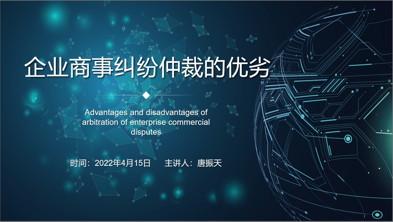 本期主讲人为唐振天律师,主讲内容是:企业商事仲裁纠纷得优劣。唐振天律师通过四部分内容,详细讲解了何为仲裁,仲裁的优劣势以及仲裁程序的实务操作。充分发挥了自身的经验,**的解答了仲裁的各种问题。